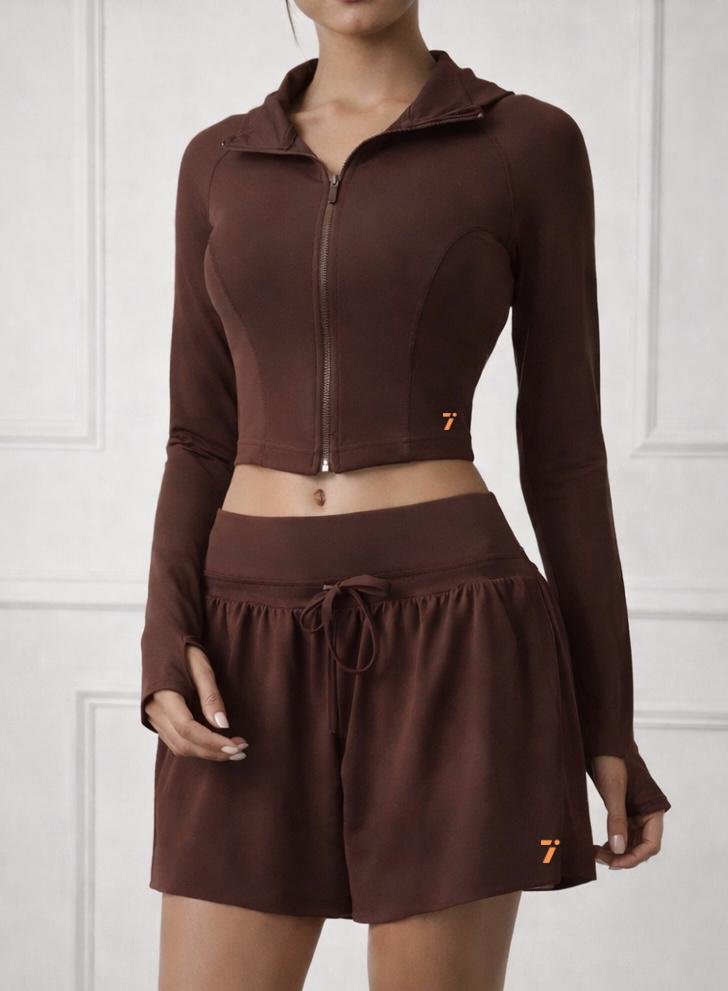 Introducing a sleek athleisure set that flawlessly blends performance, comfort, and modern aesthetics. Whether you’re heading to the gym, running errands or lounging at home, this coordinated set is designed to keep you comfortable and stylish at every turn. Crafted from a premium nylon and spandex blend, this set features a sculpted, cropped hoodie and relaxed shorts, forming a sporty silhouette that transitions seamlessly from active moments to casual days.