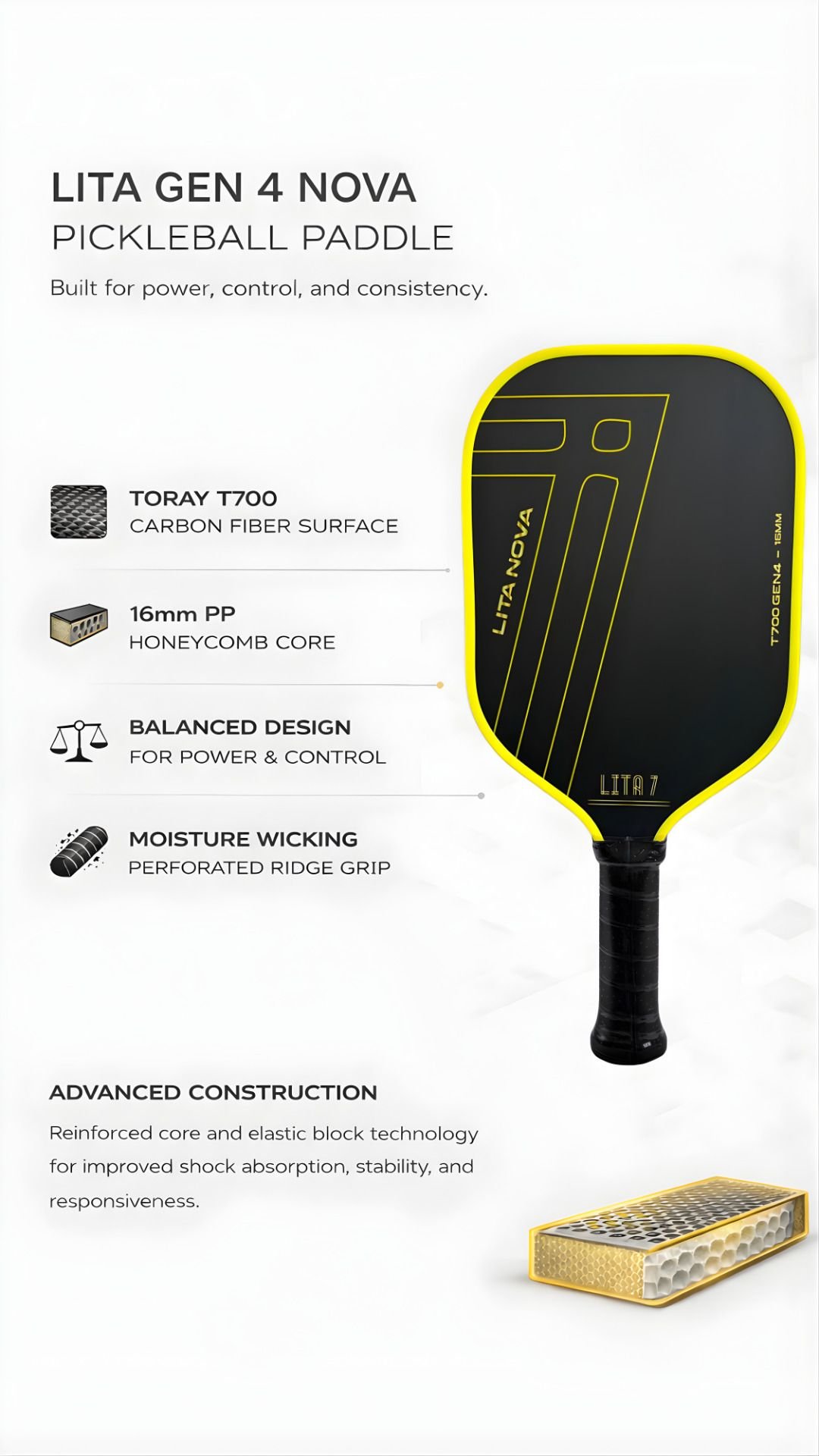Embrace the future of competitive play with the LITA 7 GEN4 NOVA Pickleball Paddle—a lightweight, responsive and balanced weapon designed to maximise your potential on court.