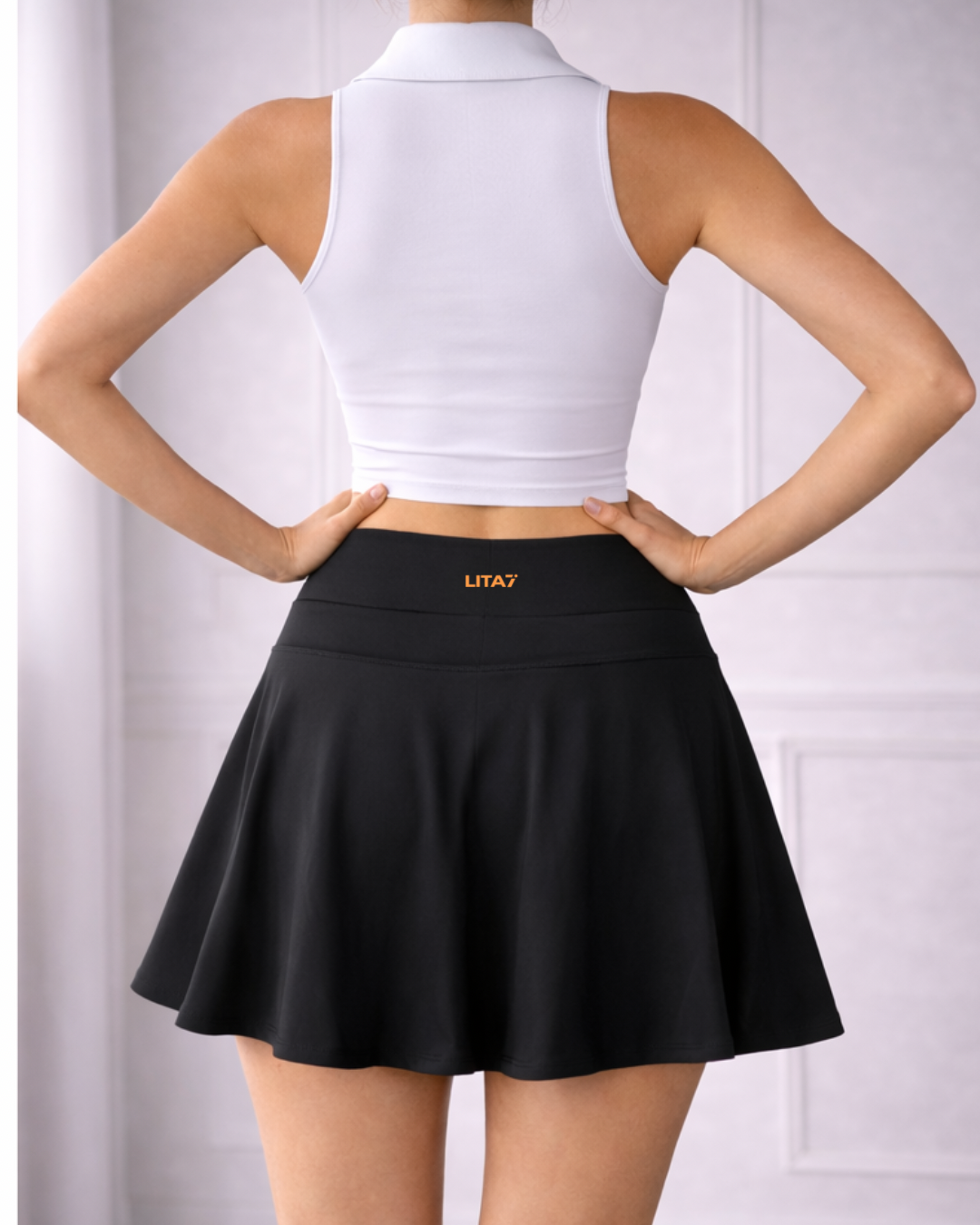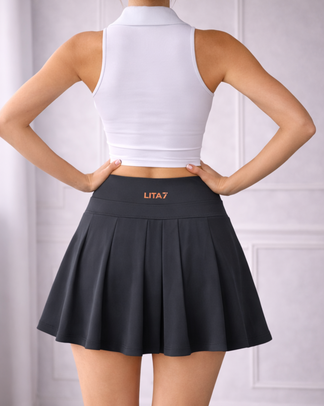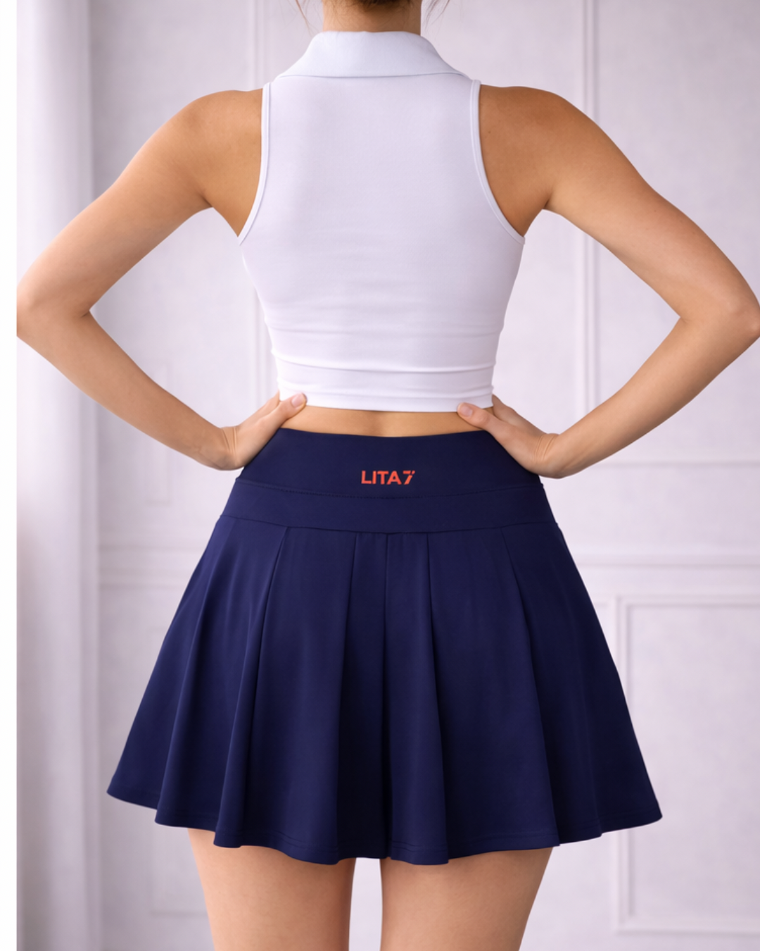 A premium performance skort designed to deliver a sleek athletic look with elevated functionality. Combining structured pleats with built-in compression shorts, this piece offers comfort, coverage and confidence while maintaining a refined silhouette that transitions seamlessly from the court to everyday wear.