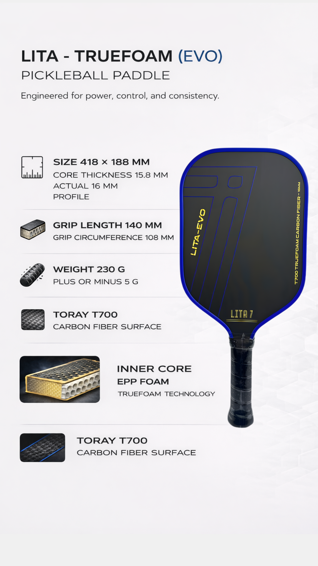 Designed for players seeking precision, control, and unrivalled consistency, the LITA Truefoam EVO Pickleball Paddle is your ultimate tool for peak performance. Built with cutting-edge Truefoam technology, this paddle offers incredible responsiveness and steady performance, complementing various playing styles from aggressive rallies to finesse net play.